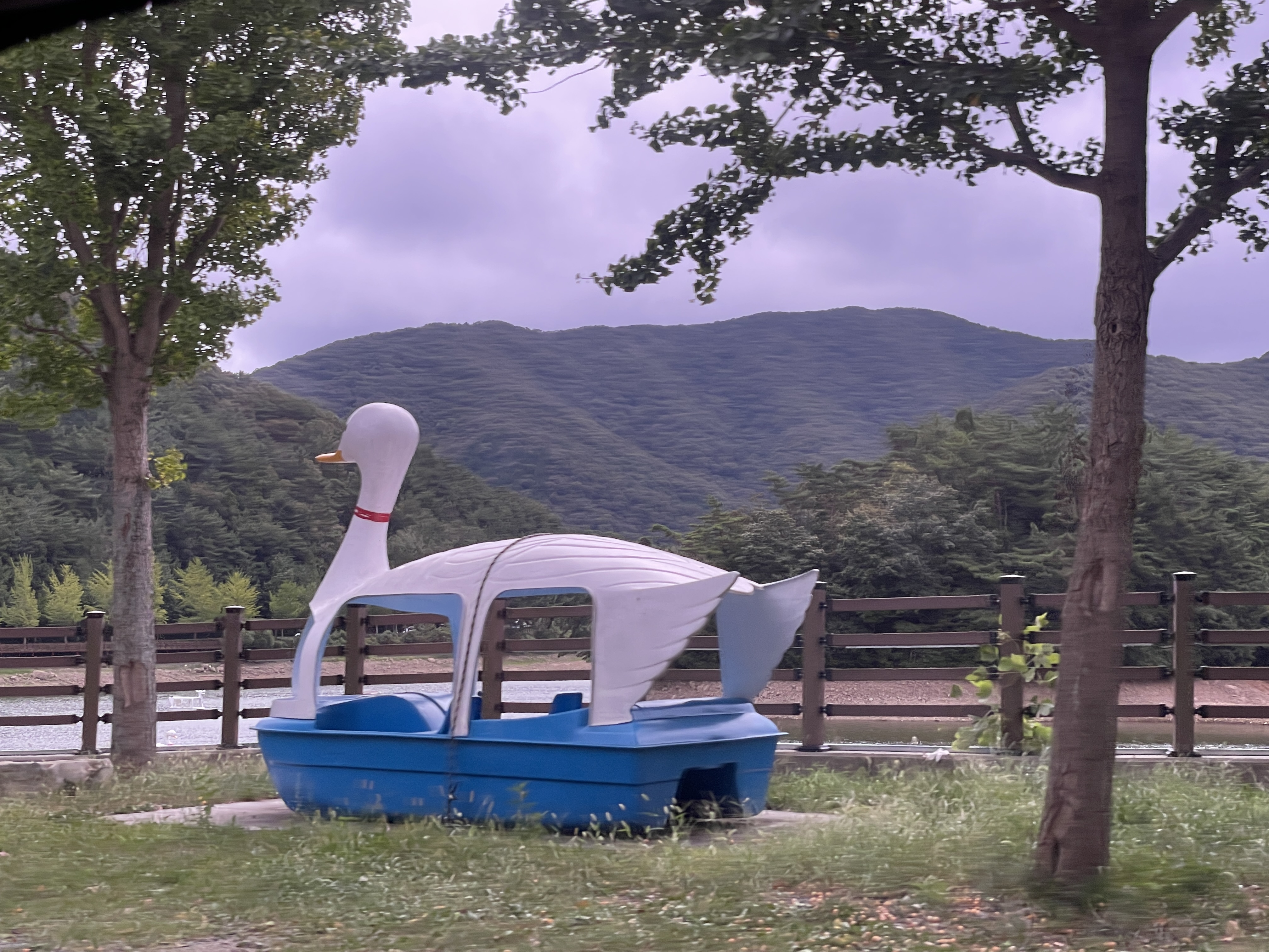 풀 숲에 있는 귀여운 오리배.